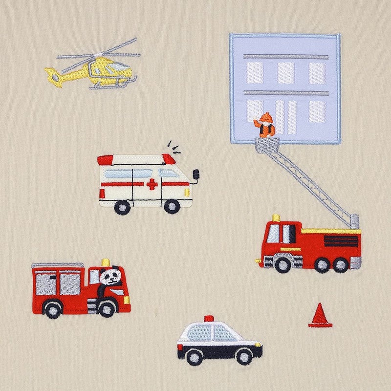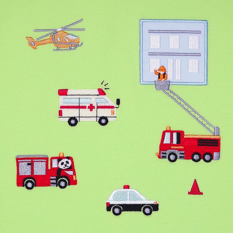 たくさんの消防車や救急車の刺繍に男の子はワクワクするはず。