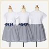 上半身は汗をよく吸うカットソー(Tシャツ生地)生地使用し、スカート部分は涼しい布帛を使用した異素材ドッキングワンピ。
