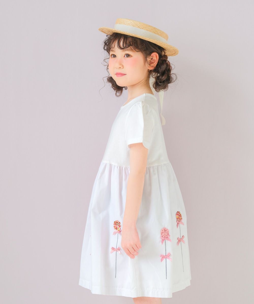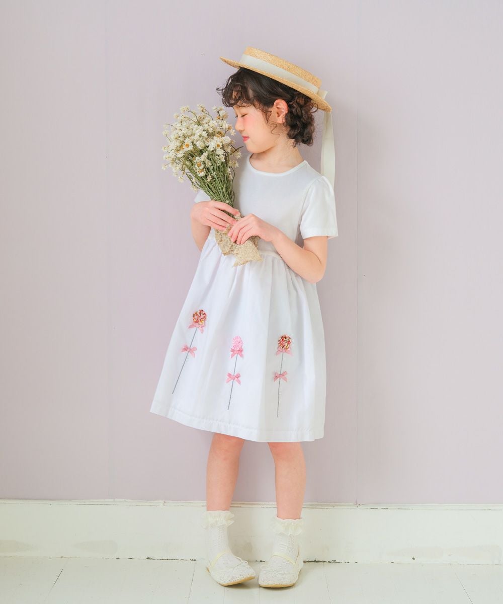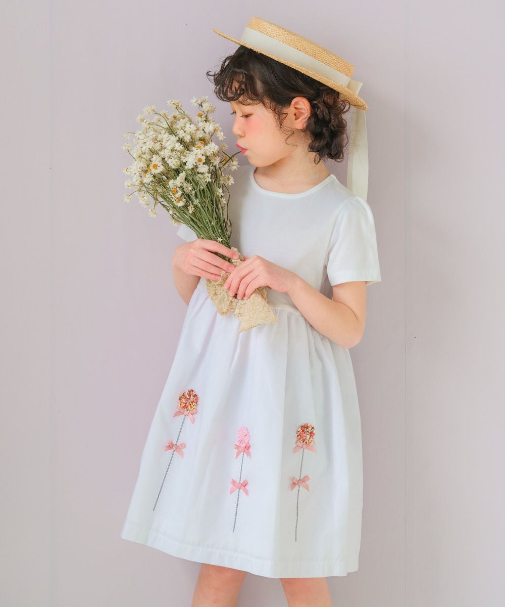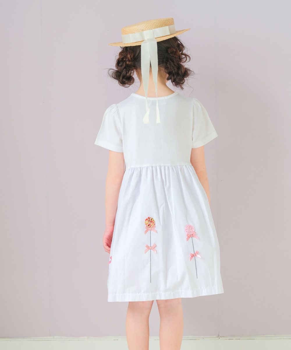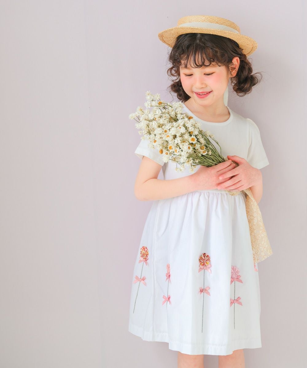 【アウトレットセール春夏 110cm限定】綿100%花モチーフ&リボンつきワンピース